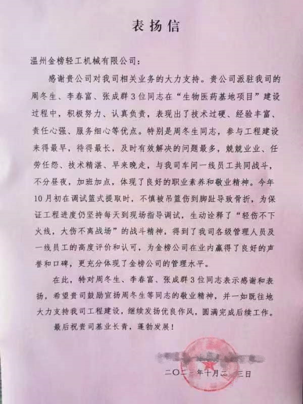 “周冬生、李春富、張成群在項(xiàng)目建設(shè)過程中,積極努力,認(rèn)真負(fù)責(zé),表現(xiàn)出技術(shù)過硬、經(jīng)驗(yàn)豐富、責(zé)任心強(qiáng)、服務(wù)細(xì)心等優(yōu)點(diǎn)?!?“及時(shí)有效解決問題,兢兢業(yè)業(yè)、任勞任怨、技術(shù)精湛、早來晚走,與車間一線員工共同戰(zhàn)斗,不分晝夜,加班加點(diǎn),體現(xiàn)了良好的職業(yè)素養(yǎng)和敬業(yè)精神?!?10月23日,溫州金榜輕工機(jī)械有限公司收到了一封來自合作客戶的表揚(yáng)信,該企業(yè)在信中對我司工作人員表示高度評價(jià)和贊揚(yáng)。